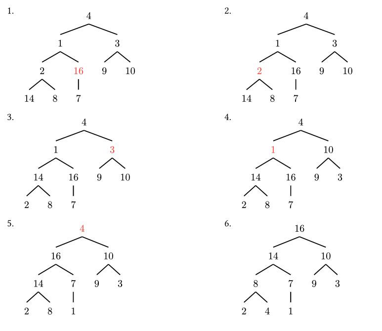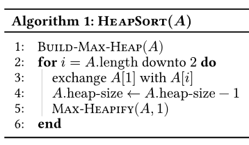is the largest element in and it is smaller than the elements in . When we put it in the -th position, then contains the largest elements, sorted. Decreasing the heap size and calling Max-Heapifyturnsinto a max-heap. Decrementing sets up the invariant for the next iteration. - Termination: After the loop